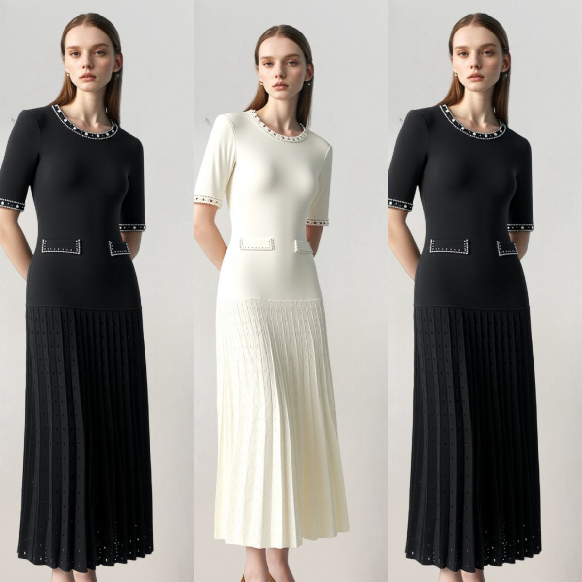 Summer New Women's Round Neck Tweed Knit Short Sleeve Dress Elegant Waist-Cinching Pleated Skirt